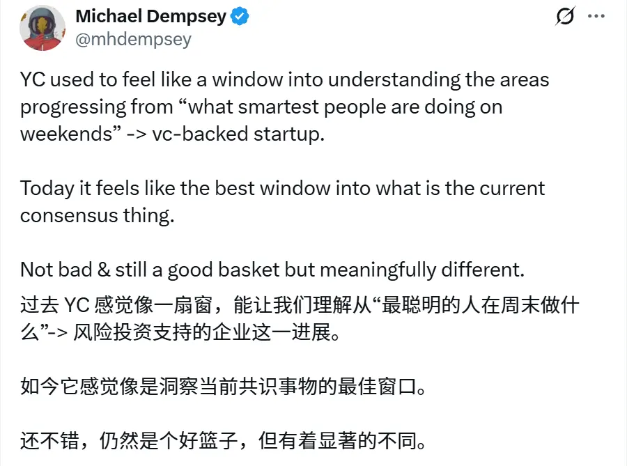 这就是 Dempsey 的评论。YC 正在成为「窥见当前主流共识的最佳窗口」。