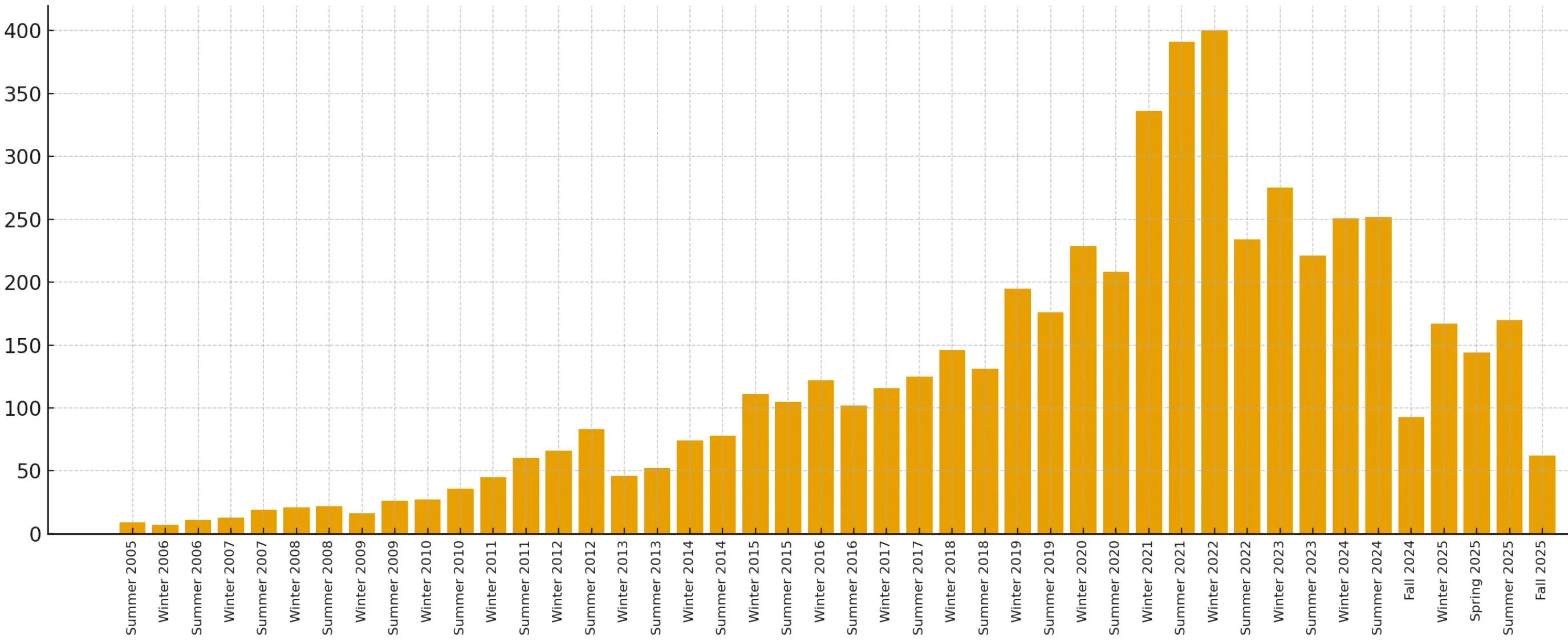 我毫不怀疑,YC 至少在最初的十年里,对世界绝对是利大于弊的。但不知从何时起,游戏规则改变了。初创公司不再那么不透明;它们变得更容易被理解。YC 不能再仅仅是揭开面纱;它必须「大规模生产」。规模从最初几年的 10-20 家,激增到 2015 年的 100 多家,最终在 2021 年和 2022 年达到每批 300-400 家的顶峰。虽然这个数字有所下降,但现在每批仍有约 150 家。