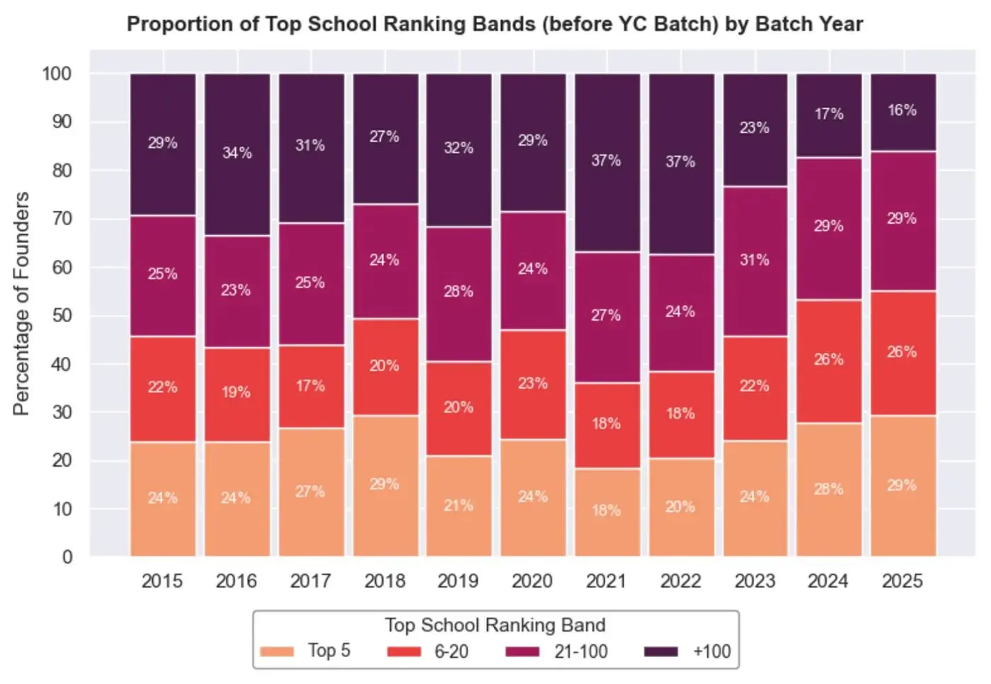 2.精英教育: 毕业于前 20 名顶尖学校的创始人比例从 2015 年的约 46% 上升到现在的 55%