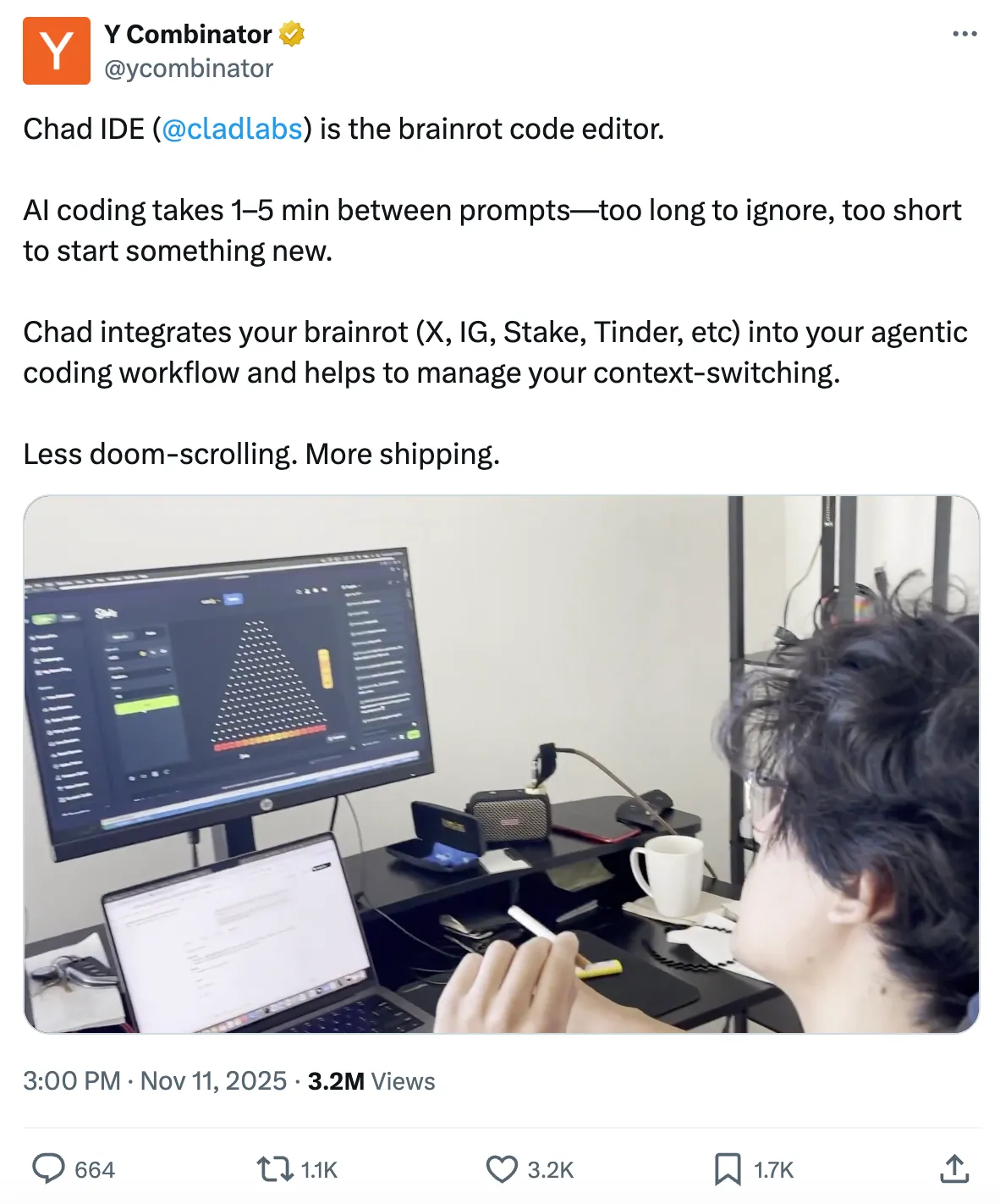 上周,YC 宣布了其最新的投资之一:Chad IDE:一个「侵蚀大脑」的项目。