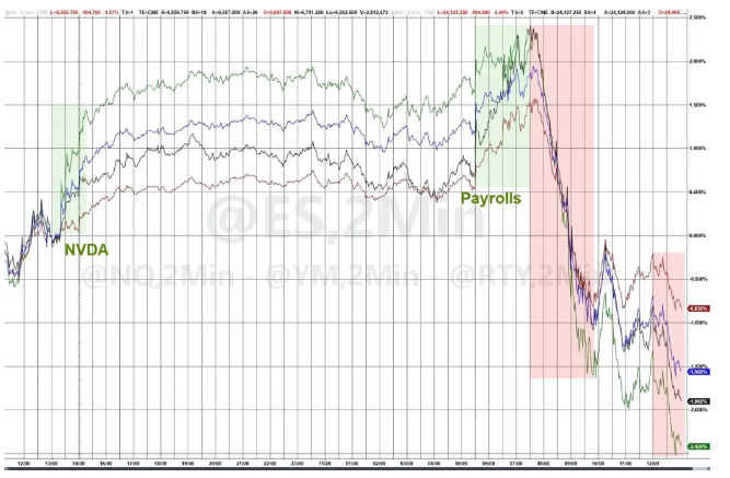 ● 昨夜美股经历了典型的“高开低走”行情。在“金发姑娘”般的非农数据和英伟达强劲财报的共同提振下,三大股指集体大幅高开。