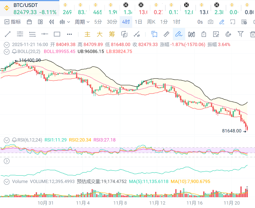 BTC:4小时级别看,价格跌破布林线下轨,价格超卖,短线可以适当买点现货。