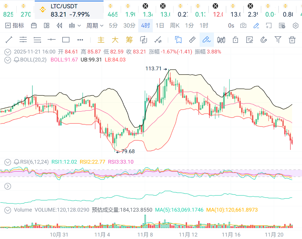 LTC:价格跌破布林线下轨,价格走势弱势,支撑位82,压力位85.