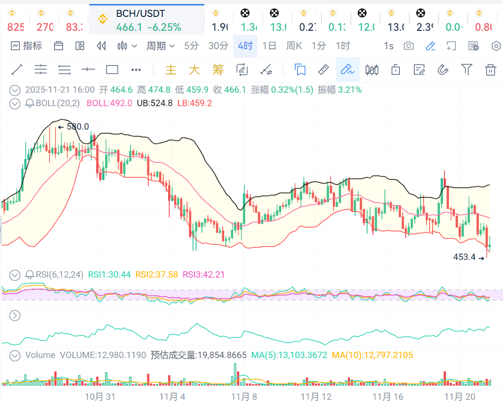 BCH:价格继续保持在布林线下轨附近,价格走势弱势,支撑位450,压力位480.