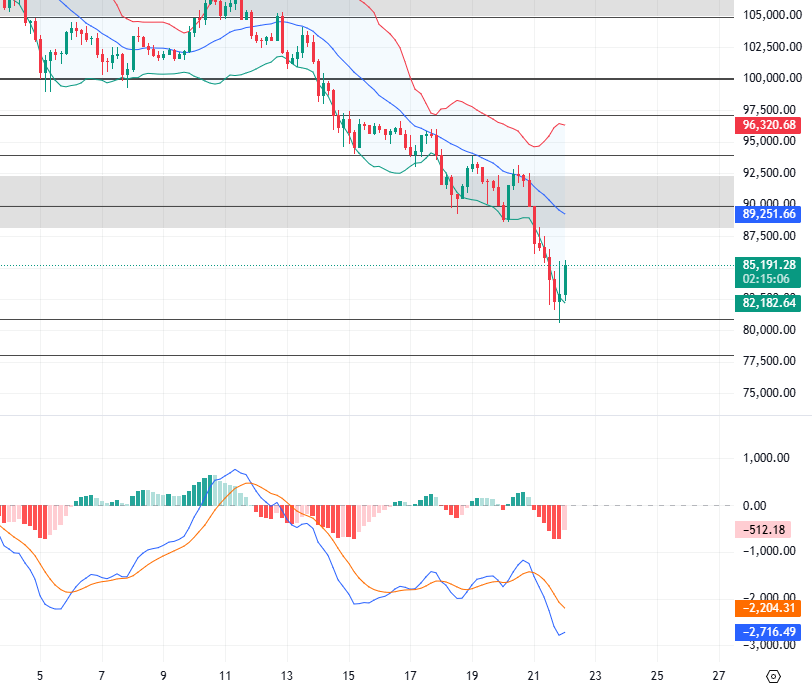 大周期级别,能看到的支撑约在 78000–76000美元,若继续跌破可能测试 70000 附近,上方压力约在90000–95000 美元。至于周末超跌后可能会存在反弹修复,先关注反弹修正情况。短周期上,下方短期支撑82000,80000区域,上方短期阻力关注88000,90000区域。