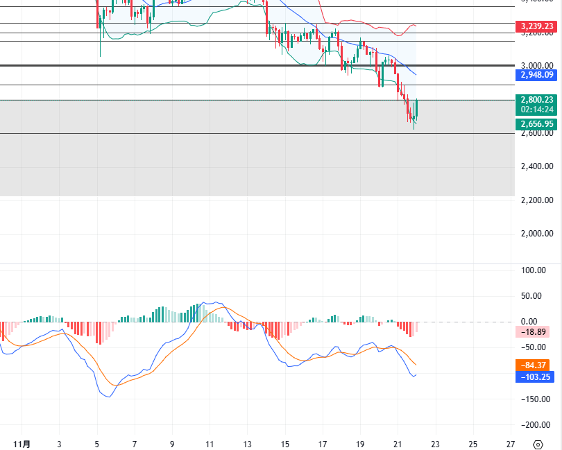 下方可见的较大区域支撑在 2600‑2300 美元,若失守可能下探 2000甚至更低;短周期修复需求,周末看反弹修正情况,上方压力在 3000关口和3150 美元,突破后才可能进一步上涨。