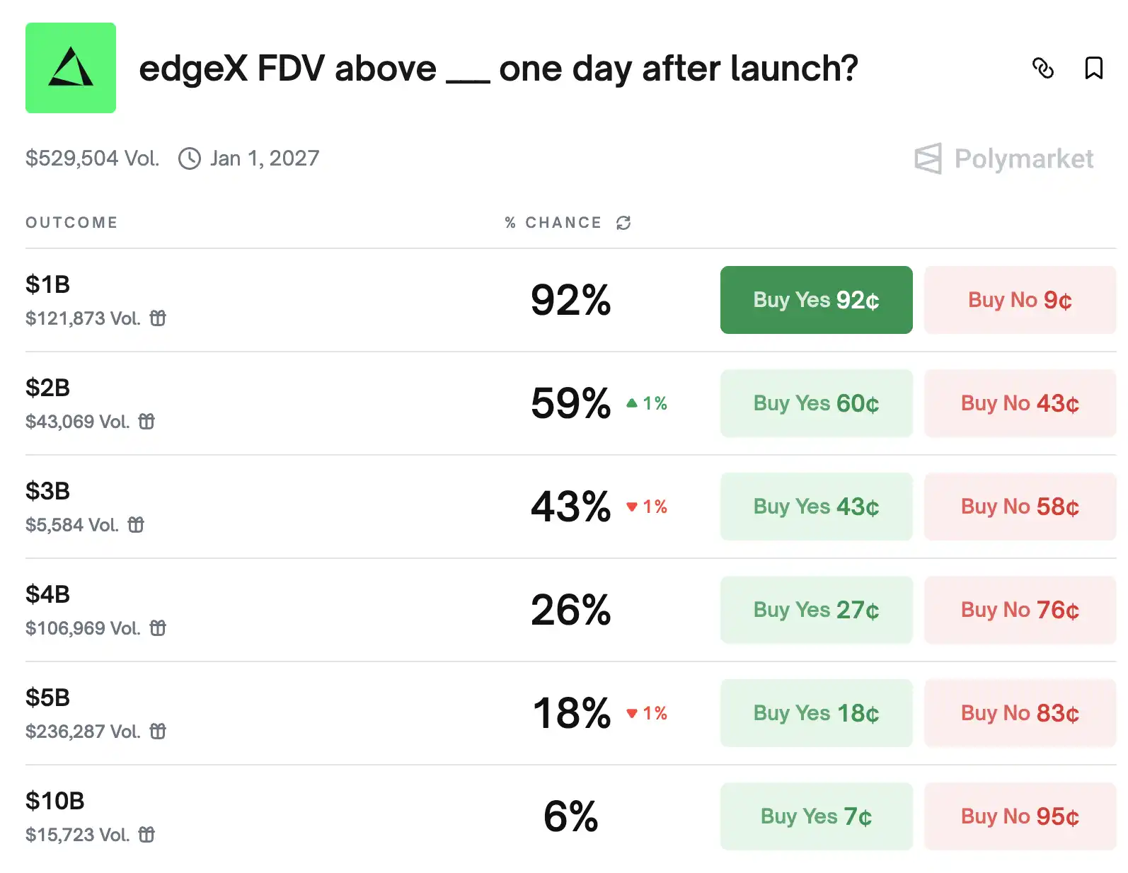 根据社区大 V 的测算,按照 edgeX 营收约为 Hyperliquid 的 16% 来估算,如果 TGE 时 FDV 达到 20-70 亿美元左右,单积分价值可能在 30-300 美元区间。当然这只是预估,实际还要看市场情况。目前 Polymarket 上的 edgeX 在 launch 第一天的 FDV 可能性概率如下: