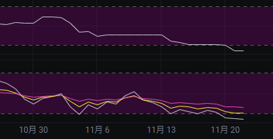 Mfi和rsi上看,目前两个指标都在超卖区域,如果多军不能快速上拉,让指标持续在超卖区域的话行情还会继续下跌。
