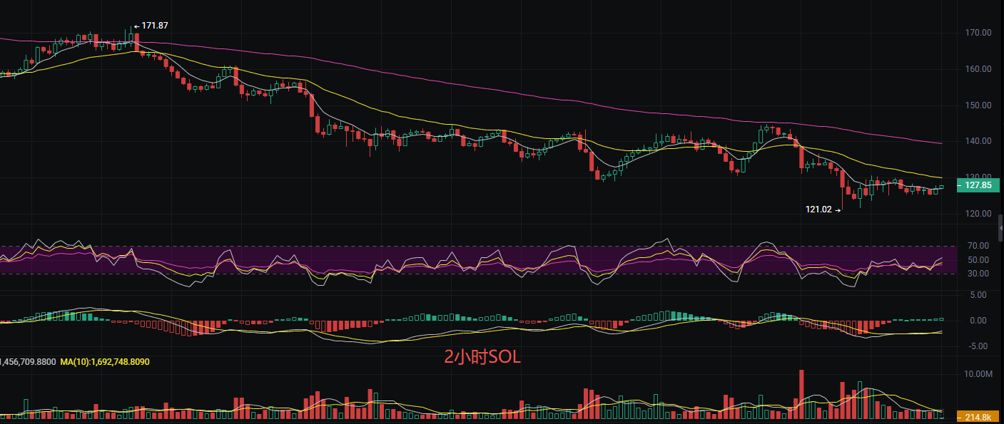 索拉拉目前价格为127.1,丽盈判断目前索拉纳SOL当前市场处于明显的下跌趋势中,技术面显示价格位于均线系统下方,形成空头排列,短期均线虽有走平迹象,但长期均线依然向下整体趋势仍偏空头主导。最近在127附近形成整理形态整体下跌后的低位盘整。MACD空头力量减弱但尚未转强。EMA趋势偏弱,短期内行情走平周末意味着没有太大的波动出现,做超短波段可以尝试,