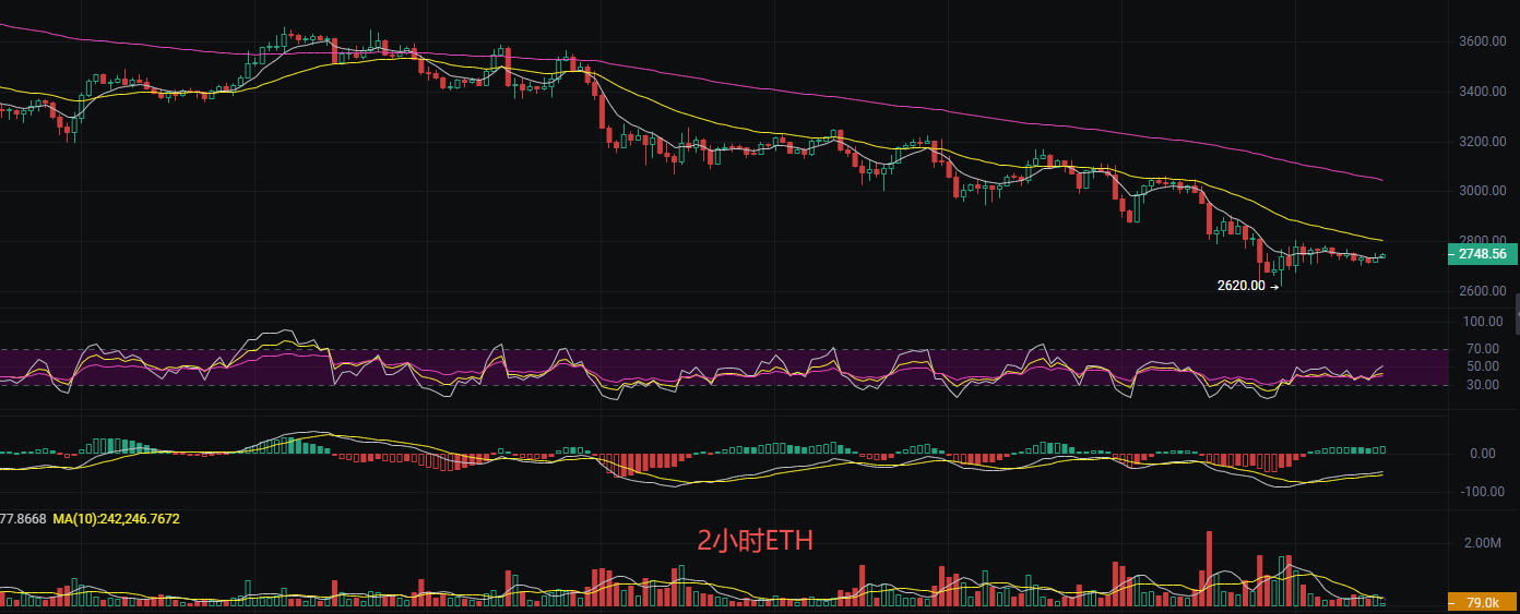 2小时在2735震荡窄幅整理形态。日线连续下跌后出现低位震荡,短期可能有反弹需求。MACD空头力量减弱,有转向迹象。EMA整体趋势仍为下行,思路上丽盈依旧保持高位开空的思路不变跟随主力顺势而为