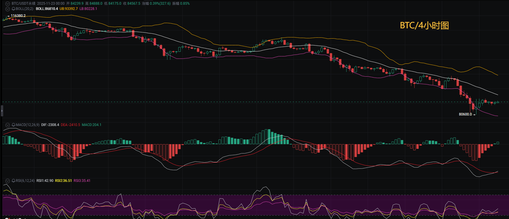 短周期小时图上看,布林带呈收口姿态,价格多次回踩83000一线附近走出反弹,由此可见此区域存在交强支撑,目前是回调处于盘整,走势在中下轨区域运行,但是上行力度减弱,所以操作上建议高空低多即可。上方压制在86500附近,短线下方支撑关注82500、其次关注8万关口一线,