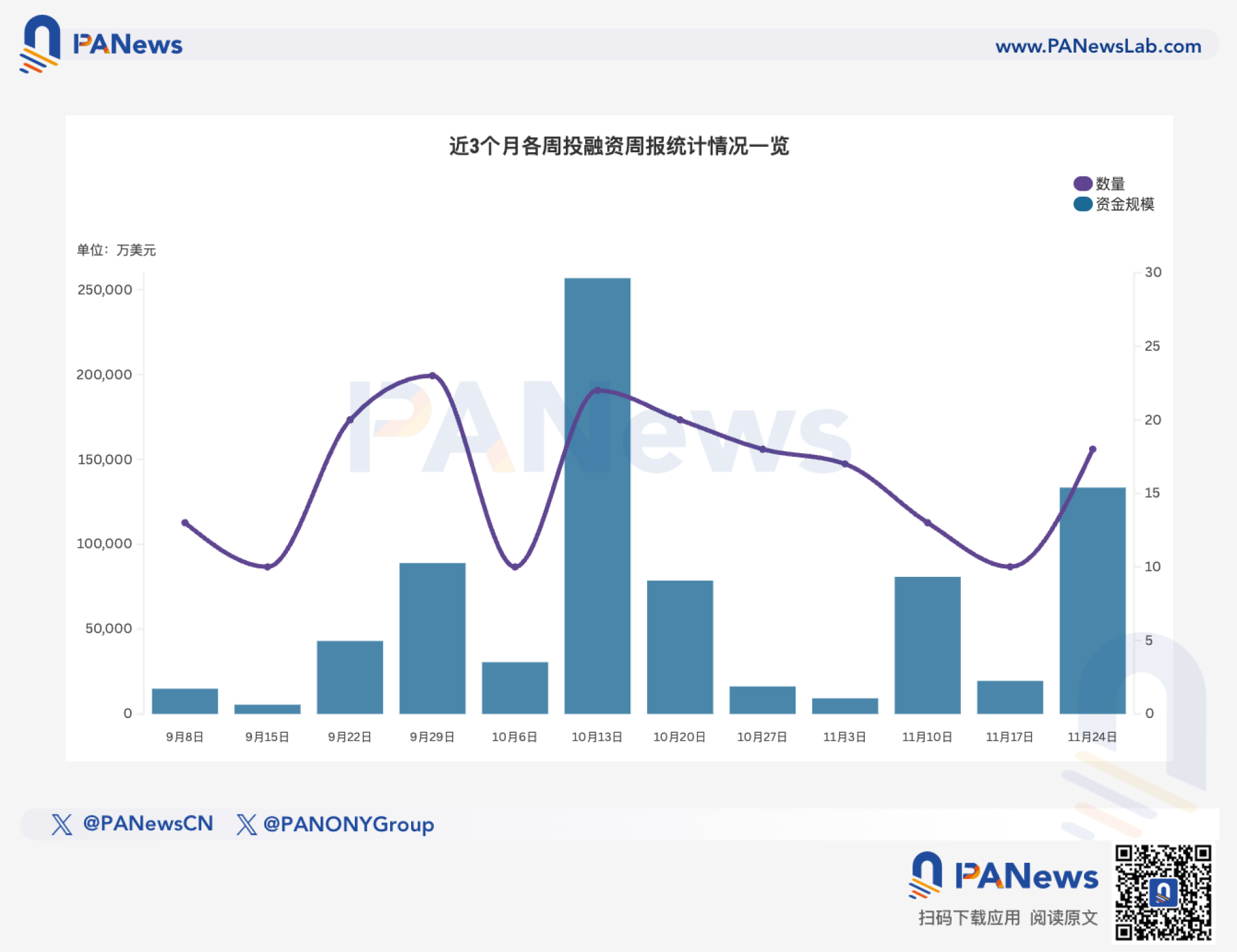 据 PANews 不完全统计,上周(11.17-11.23)全球区块链有18起投融资事件,资金总规模超13.34亿美元;此外,上市公司加密资产储备融资总额超3亿美元,概览如下概览如下: