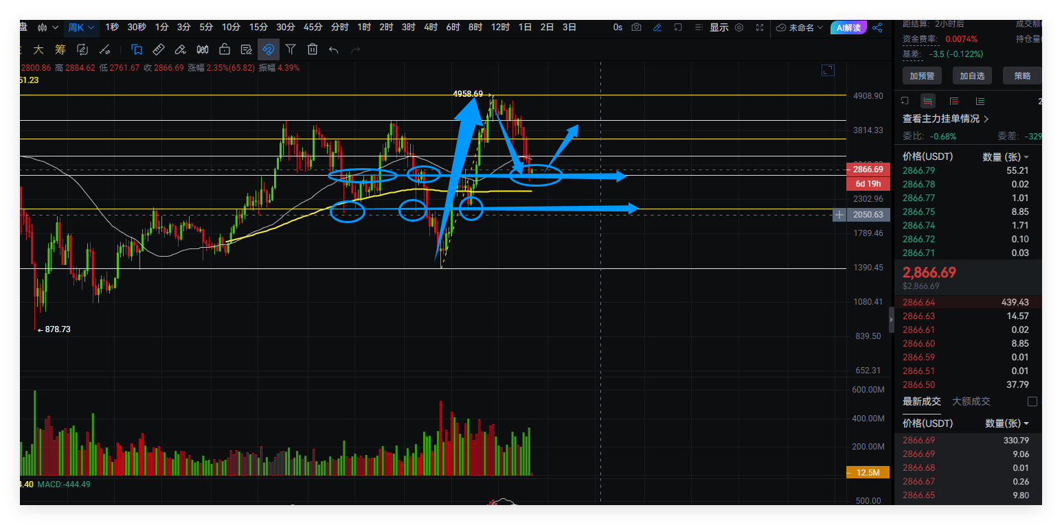 以太坊周线上看,以太坊的回调力度其实并没有大饼大,下方比较强的支撑是2150附近,前面下跌都是在这里去止跌,不过大饼开始去走反弹,以太坊独立下跌的机会也不大,以太目前到达第一支撑2750附近后收线到该位置上方,整体走势表现多头强势一点,后市走出的反弹还有机会去再破高点4958位置,交易上长线可做布局了,目标看4060附近,到达后再去看4450,短线交易者可等待回调后再来做布局,推荐点位2750附近,止损2650,目标3260-3430区间 ,自行把握进场机会;短线交易,控制风险,盈亏自理;