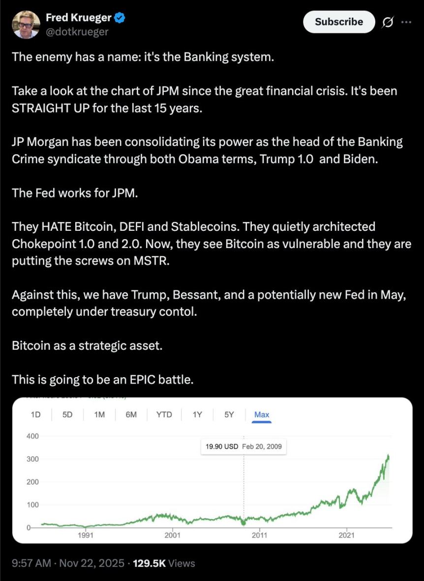 MSCI 近期发布声明提议,将持有超过 50% 资产负债表为加密货币的「数字资产财库公司」从其指数中剔除,该政策变动预计于 2026 年 1 月生效。摩根大通在一份研究报告中分享了这一消息,随即遭到比特币社区的猛烈抨击,多位币圈人士呼吁「抵制」这家金融服务巨头。