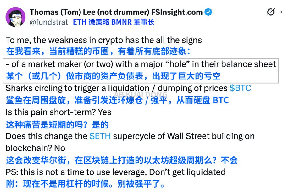 以太坊储备第一机构 BitMine 的董事长、华尔街分析师 Tom Lee 给出的解释直接指向做市商。他直言,本轮下跌背后,部分抛售来自 10 月 11 日事件中受损的做市商,而且不止一家。剧烈行情让这些高频机构的资产负债表出现缺口,他们开始回收资金、缩减交易、出售代币。依靠「点差吃饭」的做市商,此时不再是深度提供者,而成了先自救的那个。