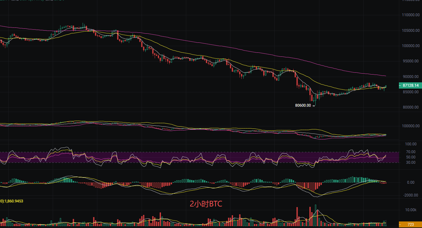 比特币现价87150,丽盈判断大饼低波动区间震荡特征,价格接近阻力位87849但动能有所增强,技术面信号存在一定矛盾:趋势指标仍显示空头排列但短期K线形态出现看涨吞没,形成潜在看涨共振。布林带中轨附近的价格位置进一步表明市场情绪较为平衡,短期内难以形成明确的突破方向。日线低位有较强买盘支撑。2小时K线为小阳线短期多头力量占优。MACD2小时多头信号增强;日线级别仍处于弱势修复阶段,EMA短期均线支撑有效,整体趋势偏多。现在行情来到了两个极端,短线全面多头趋势,长线全面空势, 思路上丽盈跟随大级别趋势高空为主的思路