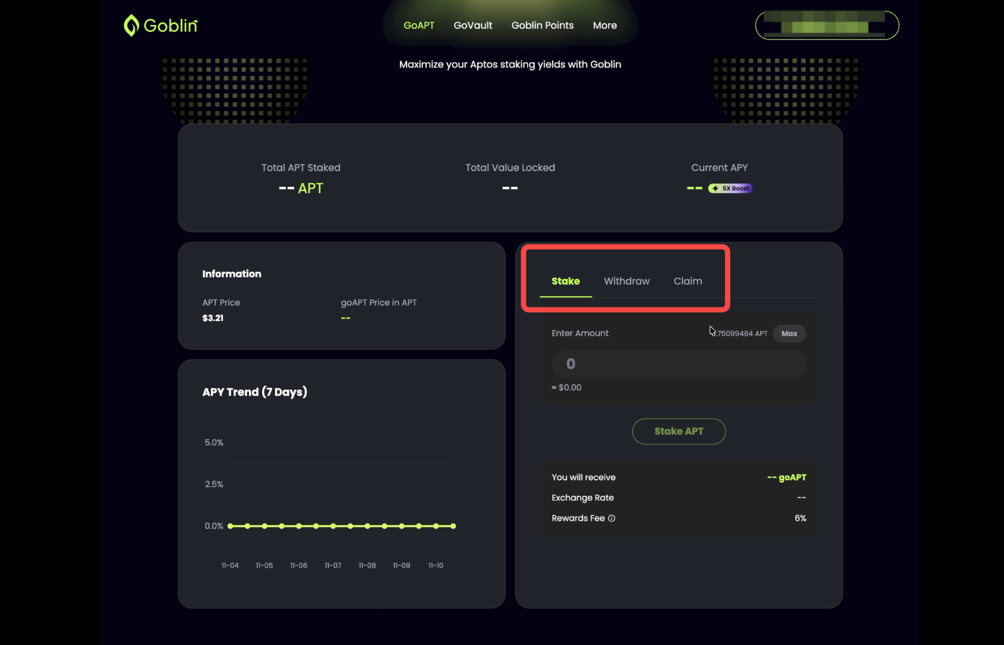 用户可以直接在 Goblin 平台上质押 APT 并铸造 GoAPT,并即刻开始积累双重收益。GoAPT 的使用过程非常简单: