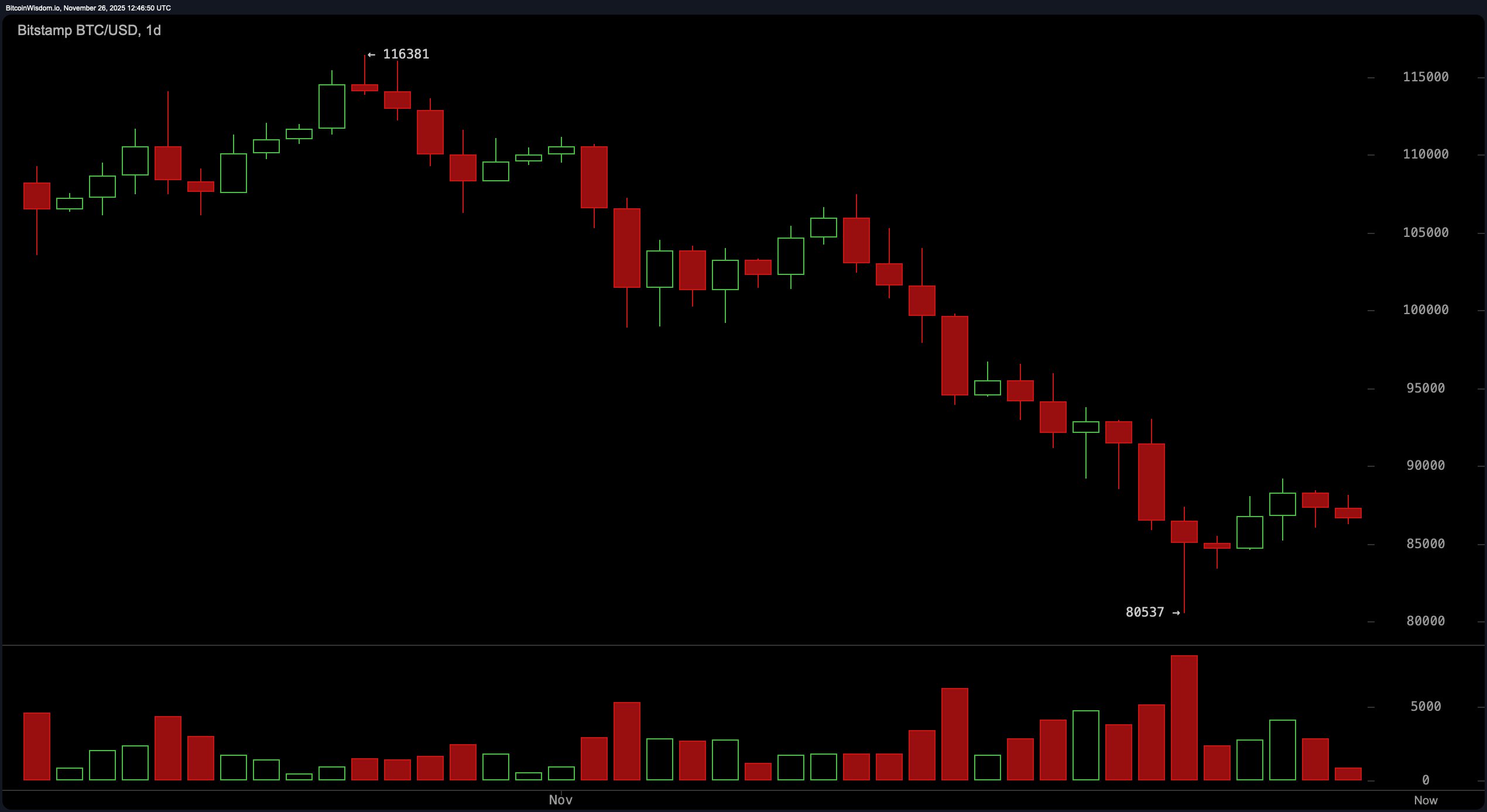 2025年11月26日通过Bitstamp的BTC/USD日线图。