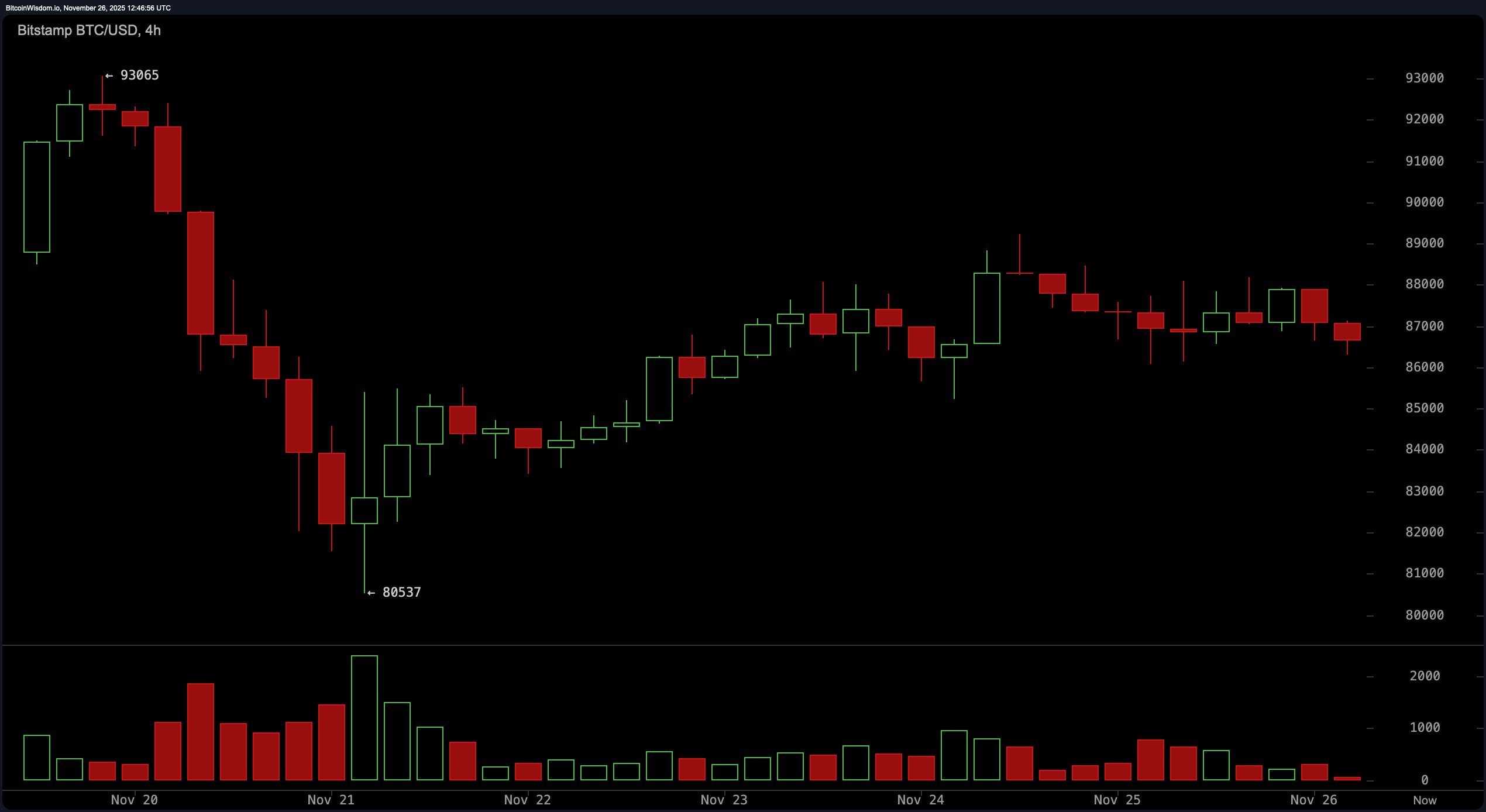 2025年11月26日通过Bitstamp的BTC/USD 4小时图。