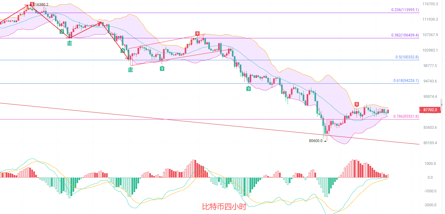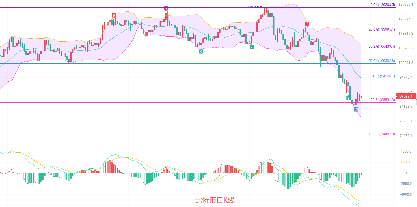 日K线发稿前最高88200,最低86260,EMA趋势指标向下空势不变,EMA15快线已经抵达了91000,MACD底部背离缩量减少,K线收缩,DIF和DEA收缩有形成金叉的趋势,布林带下轨还在下移已经抵达了8万关口,中轨目前还在94000,主力还在选择方向的过程中