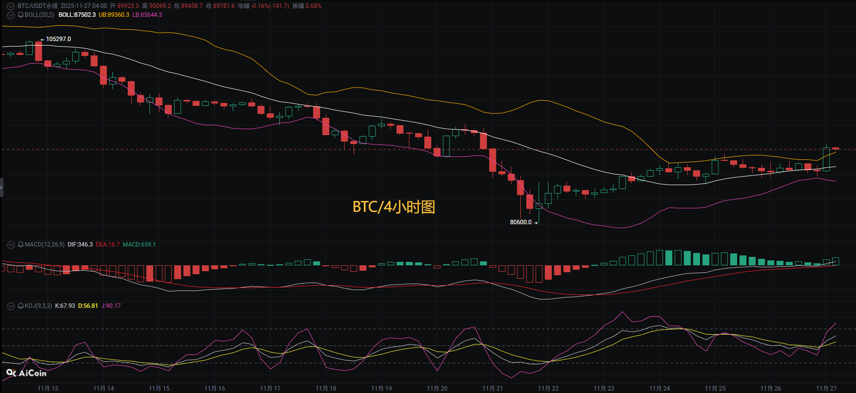 比特币日内承压进入盘整,至晚间价格回踩86600位置附近反弹,目前走势在9万关口附近运行,短期多头逐渐回暖复苏,在日线级别,近期价格形成双底结构,其低点分别位于11月21日的80600与11月24日的85272,随后市场突破颈线位88500并加速上行至90418。四小时图上,出现了连续三根放量阳线(26日01:00至04:00),但最新K线在90000整数关口收出长上影线,显示短期面临抛压。