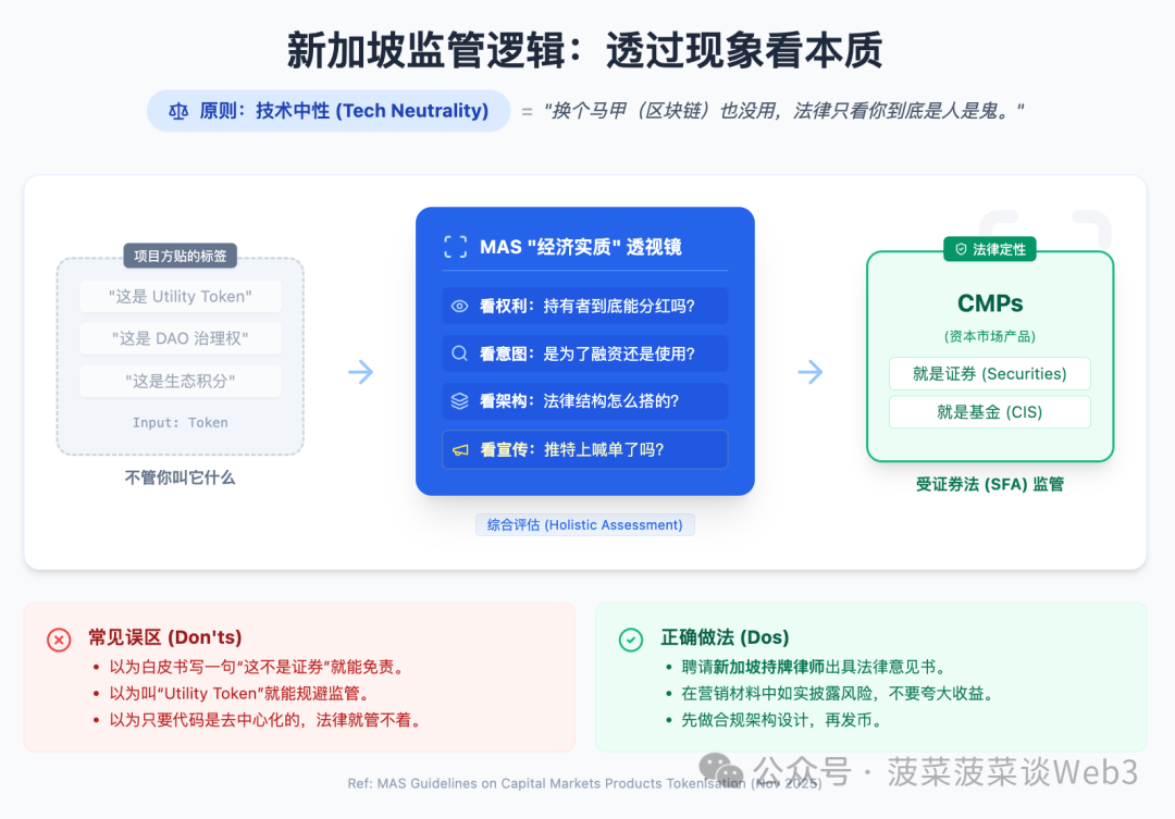 无论你用的是区块链、智能合约还是传统数据库,只要代币的经济实质构成了证券/CIS单位/衍生品,就要按相应的规则来监管。代币化不改变法律性质,技术创新不等于监管豁免。