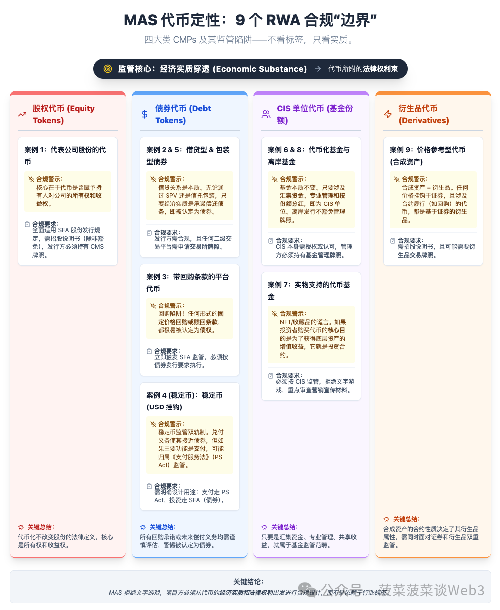 MAS在指南中给出了9个"构成CMPs"的案例,覆盖了股权代币、债券代币、CIS单位代币、衍生品代币四大类型。