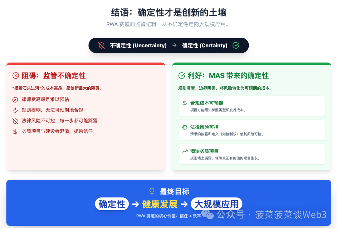 真正扼杀创新的不是监管本身,而是不确定性,只有给出清晰明确的监管框架,告诉行业"什么能做、什么不能做、怎么做才合规",整个RWA赛道才可能迎来爆发式增长。