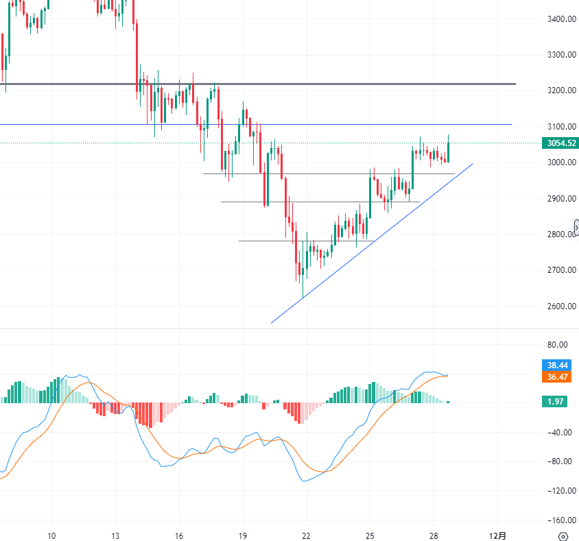 以太坊当前稳定在 3000 美元附近,较上周 2680 美元低点反弹10%,成功站稳2800-2900 美元关键区间。昨日盘中在 3070 一线短暂承压后快速回调,随后震荡回升,感恩节期间市场流动性温和,价格波动收窄,呈现 “稳中有升” 态势。