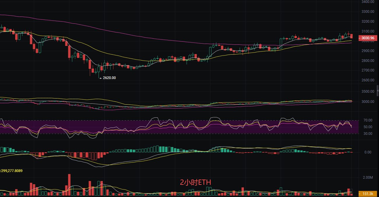 在3000-3100区间内震荡,整体呈现小幅上涨趋势。MACD短期多头力量增强,EMA均线呈现多头排列,短期支撑位3050附近,压力位3099,趋势开始转变,短期走盘整,中期开多,长期看空,主力在3100受阻方向选择明显,等方向确认以后在进场