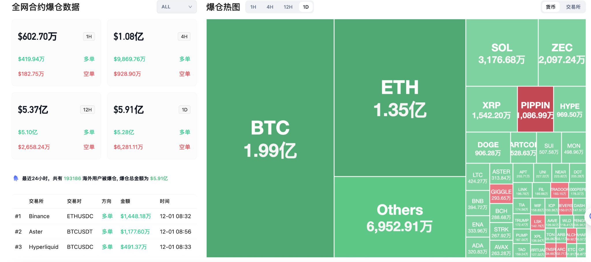 • 24小时爆仓数据:全球共193186人被爆仓 ,爆仓总金额为5.91亿美元,其BTC爆仓1.99亿美元、ETH爆仓1.35亿美元、SOL爆仓3177万美元