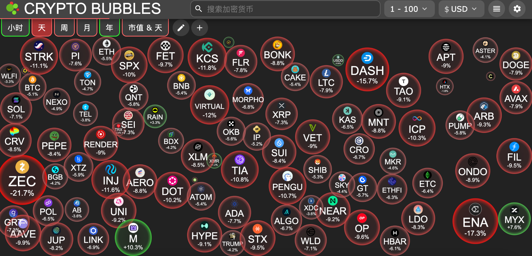 今日市值前100币种最大跌幅:Zcash跌21.7%、Ethena跌17.2%、Dash跌15.5%、KuCoin跌12.1%、Virtuals Protocol跌12%。