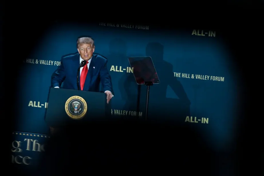 特朗普总统于七月在华盛顿一次人工智能峰会上发言,该峰会由科技播客「All-In」及科技会议「Hill & Valley Forum」的组织者共同主办。图片来源:Kenny Holston/The New York Times