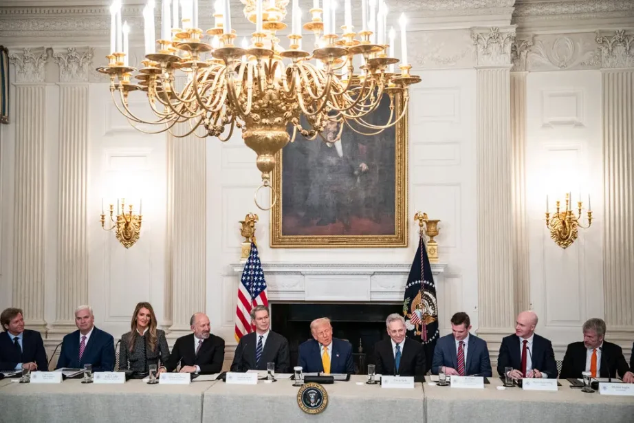David Sacks 坐在特朗普总统右侧,参与三月白宫数字资产峰会。自 2024 年中以来,特朗普已三次出席「All-In」播客。图片来源:Haiyun Jiang for The New York Times