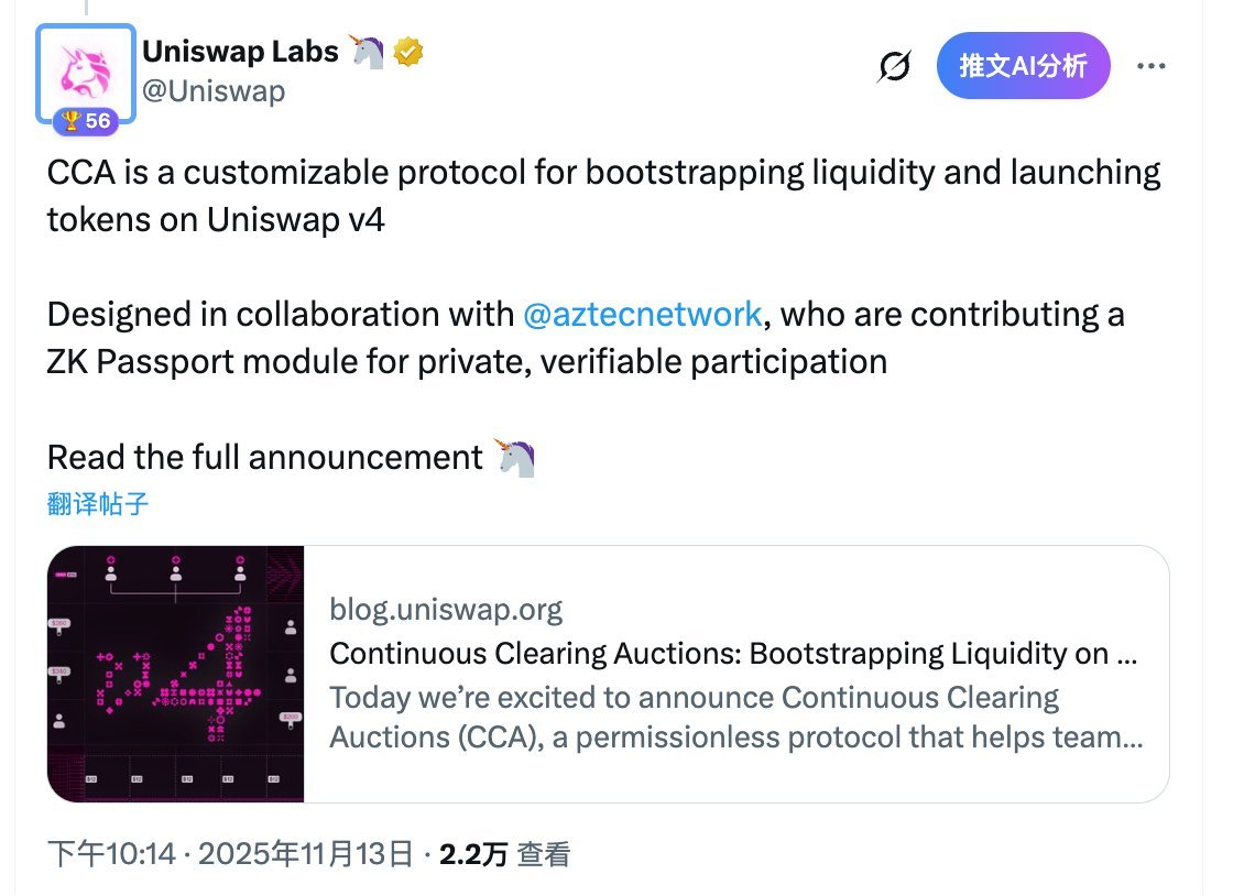 🧐 聊聊 Uniswap @Uniswap 上首个 CCA 拍卖项目 Aztec @aztecnetwork |a16z 75% 折扣价能否“抄到底”?前段时间 Uni 发布了他们最新的连续清算拍卖