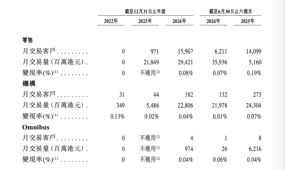 机构方是撑起交易量的主力军。截至2025年6月30日,HashKey Exchange的注册用户超过1,446.926个,较2024年末增长8.2%,但实际存入法定货币或数字资产的客户仅占约9.6%(138,517个)。其客户主要由机构客户(包括银行、资产管理公司、家族办公室、对冲基金及Web3开发者)、Omnibus客户(如持牌证券公司)、生态系统合作伙伴以及零售用户组成。其中,机构方是交易主力。约273个机构客户的月均交易量达243亿港元,约为同期零售客户交易量的4.7倍。尽管机构客户数量远少于零售,但其交易规模巨大,且变现率从去年的0.01%提升至0.07%,机构客户的收入贡献效率明显改善。相比之下,零售客户月均14,099人,完成交易量514.6亿港元,变现率为0.19%。
