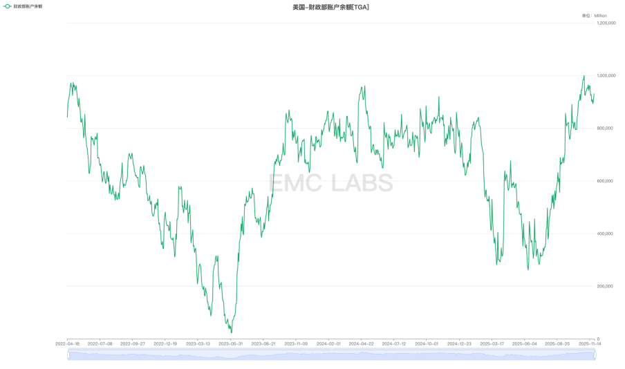 截止11月12日,美国政府停摆达到43天,创下历史记录。停摆期间,财政支出被大幅压缩,但税收、关税等收入仍在持续流入,形成“只进不出”的现金流堆积,直接推高财政部在美联储的TGA账户余额,形成对市场的猛烈“吸水”。