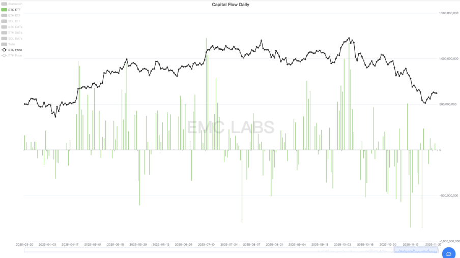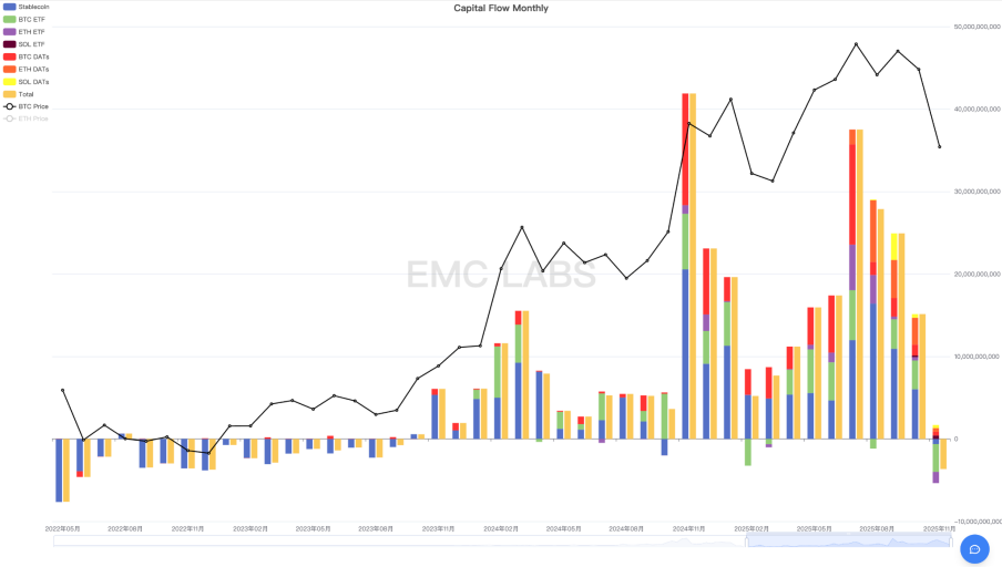 首先,透过eMerge Engine加密市场全通道资金进出统计,我们可以看到11月加密市场共录得超过36亿美元的流出,其中BTC ETF通道为33.82亿,ETH ETF通道为13.52亿,稳定币6.15亿,SOL ETF录得4.12亿正流入。BTC/ETH/SOL 财库公司整体录得正流入,共计约12.98亿。