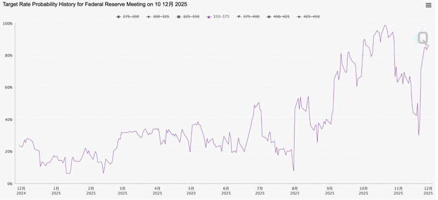 BTC和美股的真正止跌拐点,出现在11月21日。是日为周五,美联储“三号人物”、纽约联储主席约翰·威廉姆斯在公共论坛中表述,就业下行风险已增加,存在进一步调整联邦基金利率的空间,以使政策立场更接近中性区间。这一表态被认为是美联储“管理层”的意见,当日12月降息概率迅速被交易至70%之上,美股和BTC均由跌转涨。