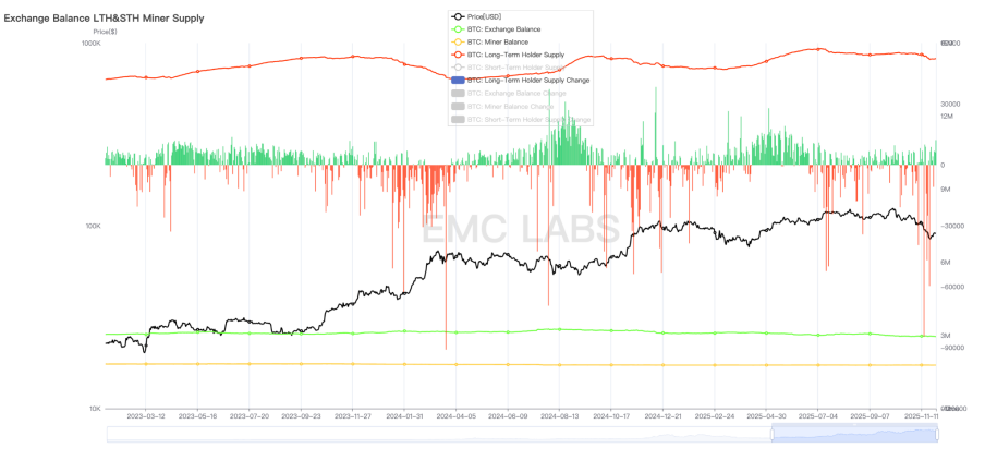 与以往两拨在BTC价格上涨中规模减持不同,本拨减持主要在7~11月价格走平甚至在价格快速下跌中展开。长手群体的这一行为其实并非反常,与其在“牛转熊”后的行为依然一致。考虑到历时十几年形成的减半牛市的“思想钢印”的巨大影响力,以及10月左右达到过往周期牛市高点的“巧合”,我们相信的确有足够规模的长手群体,依然在恪守“周期律”而展开“牛转熊”后的抛售。这一抛售是放大BTC跌幅的重要原因。
