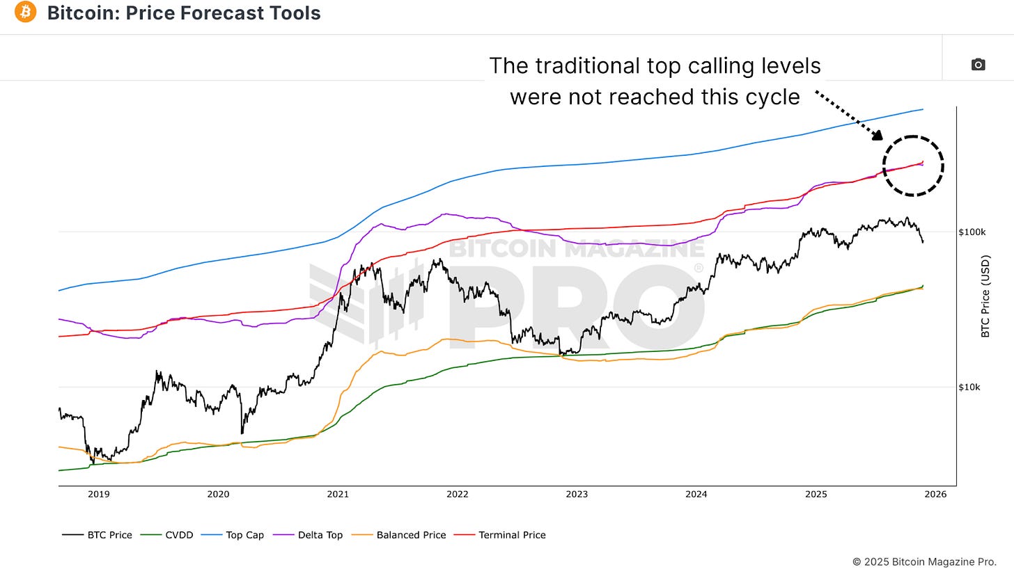 图 1:历史上可靠的顶部模型,例如 Top Cap、Delta Top 和 Terminal Price,在本轮牛市周期中未达到。