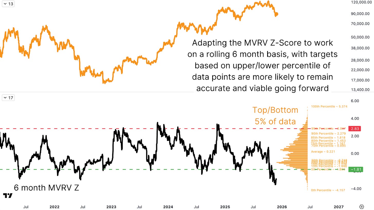 图 3:经过重新调整的 6 个月 MVRV Z-Score,带有目标化的上下百分,提供了更及时的买入 / 卖出信号。