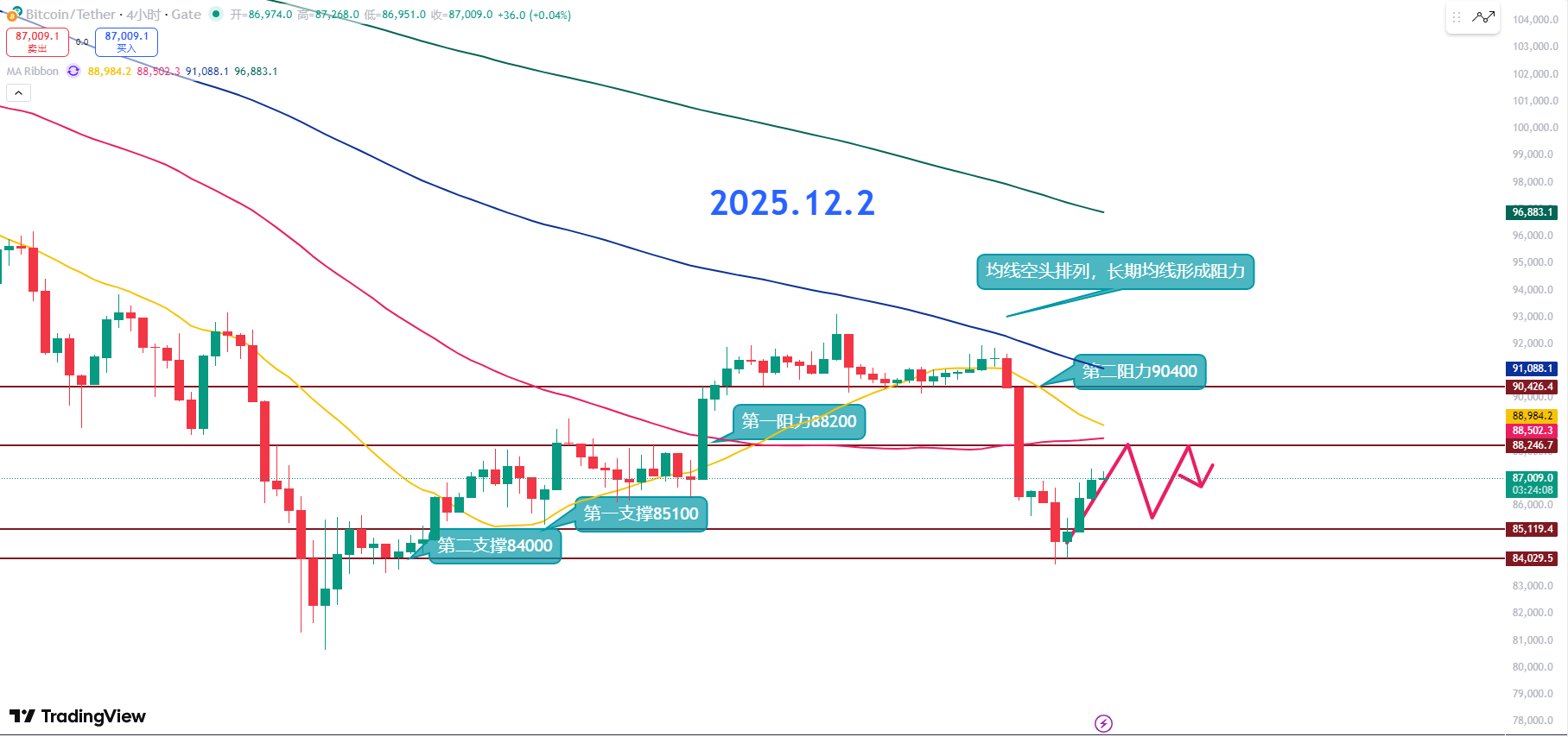 第一阻力88.2K若站不稳,就是典型的反弹见顶,会有继续下行的调整。突破并企稳后,可以期待它回踩确认支撑,再挑战90K。