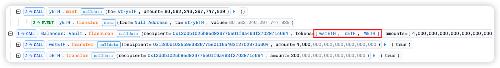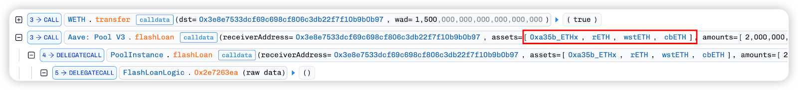 首先通过 2 个闪电贷分别从 Balancer 和 Aave 中借出 wstETH, rETH, WETH 和 0xa35b_ETHx, rETH, wstETH, cbETH。