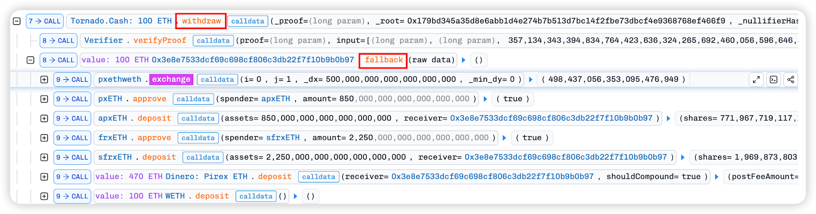 在闪电贷回调函数中将借出的 ETH 用 1100 ETH 存入 Tornado.Cash: 100 ETH 混币,随后借助 Tornado.Cash: 100 ETHwithdraw 函数取款 100 ETH 到恶意合约 0x3e8e7533dcf69c698Cf806C3DB22f7f10B9B0b97 并触发其 fallback 函数。