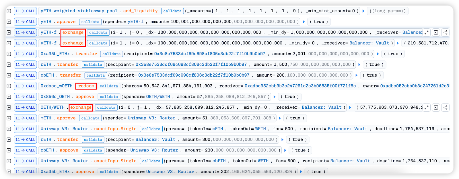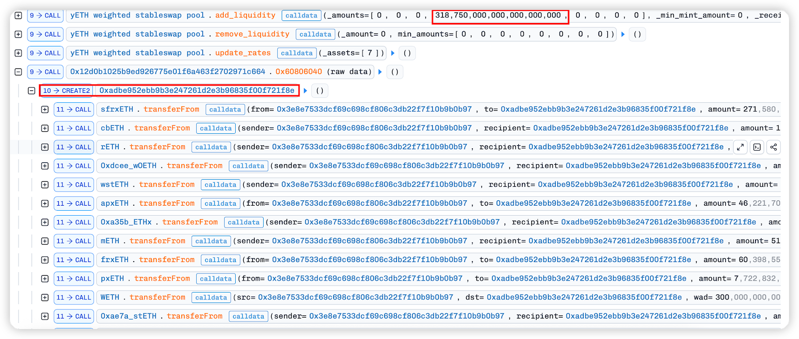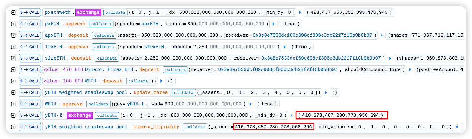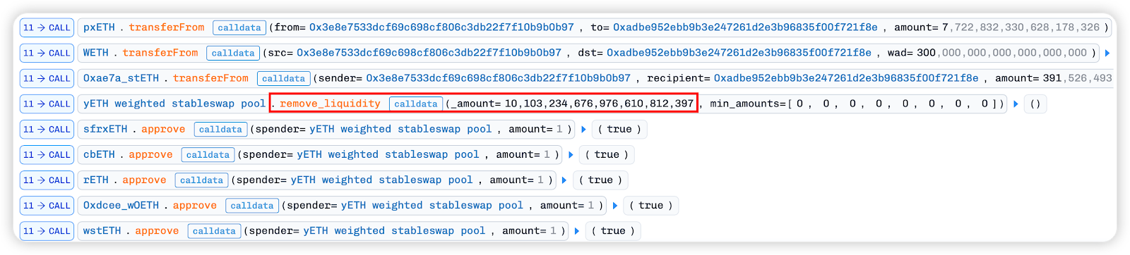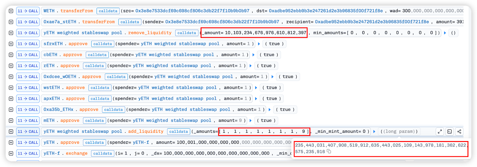 在 fallack 函数中,可以看到下图最后一笔 exchange 与下一步 remove_liquidity 数值一致,可以推断前面的步骤都是为了将闪电贷得到的资产都通过 exchange 等操作兑换成大量的 yETH weighted stableswap pool 的 LP 代币,为后续攻击做准备。