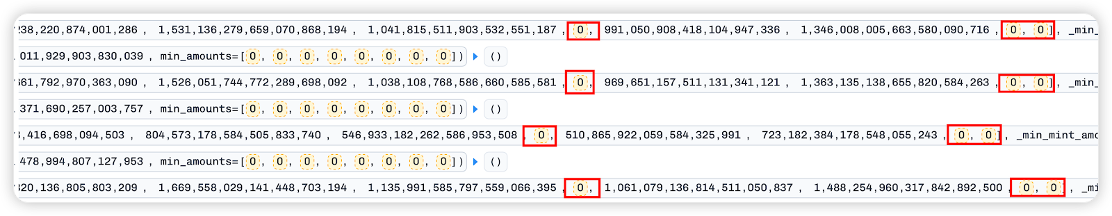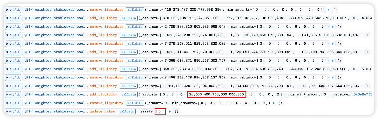 - 操作: 攻击者反复调用 add_liquidity,但刻意避开 index 3 (rETH), index 6 (wOETH), index 7 (mETH)。
