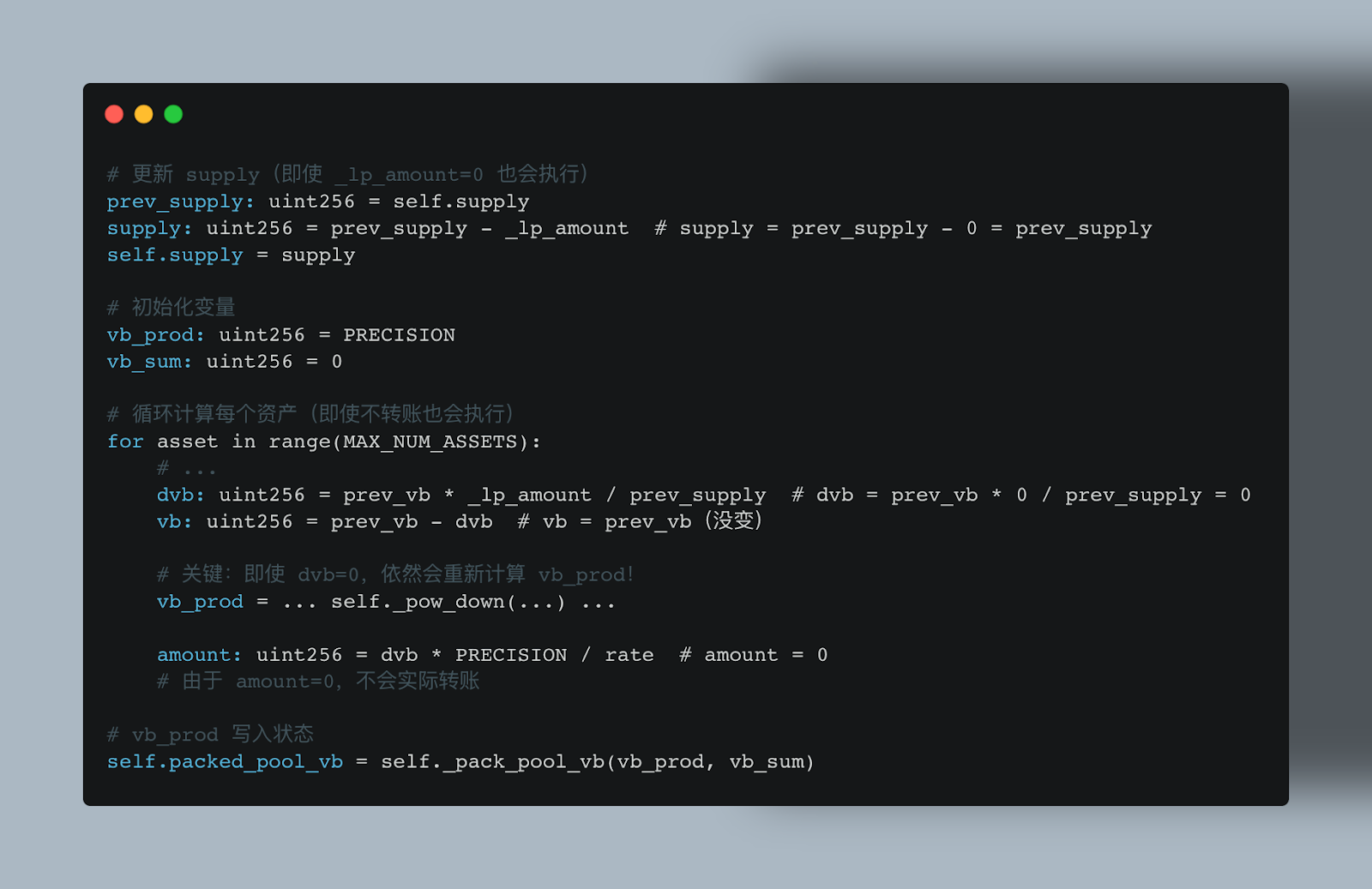 remove_liquidity 函数没有对 0⾦额进⾏短路处理,依然执⾏了完整的 vb_prod 计算循环,并且是基于上述人为制造的池子中代币数量差距计算并更新全局 packed_pool_vb 状态。