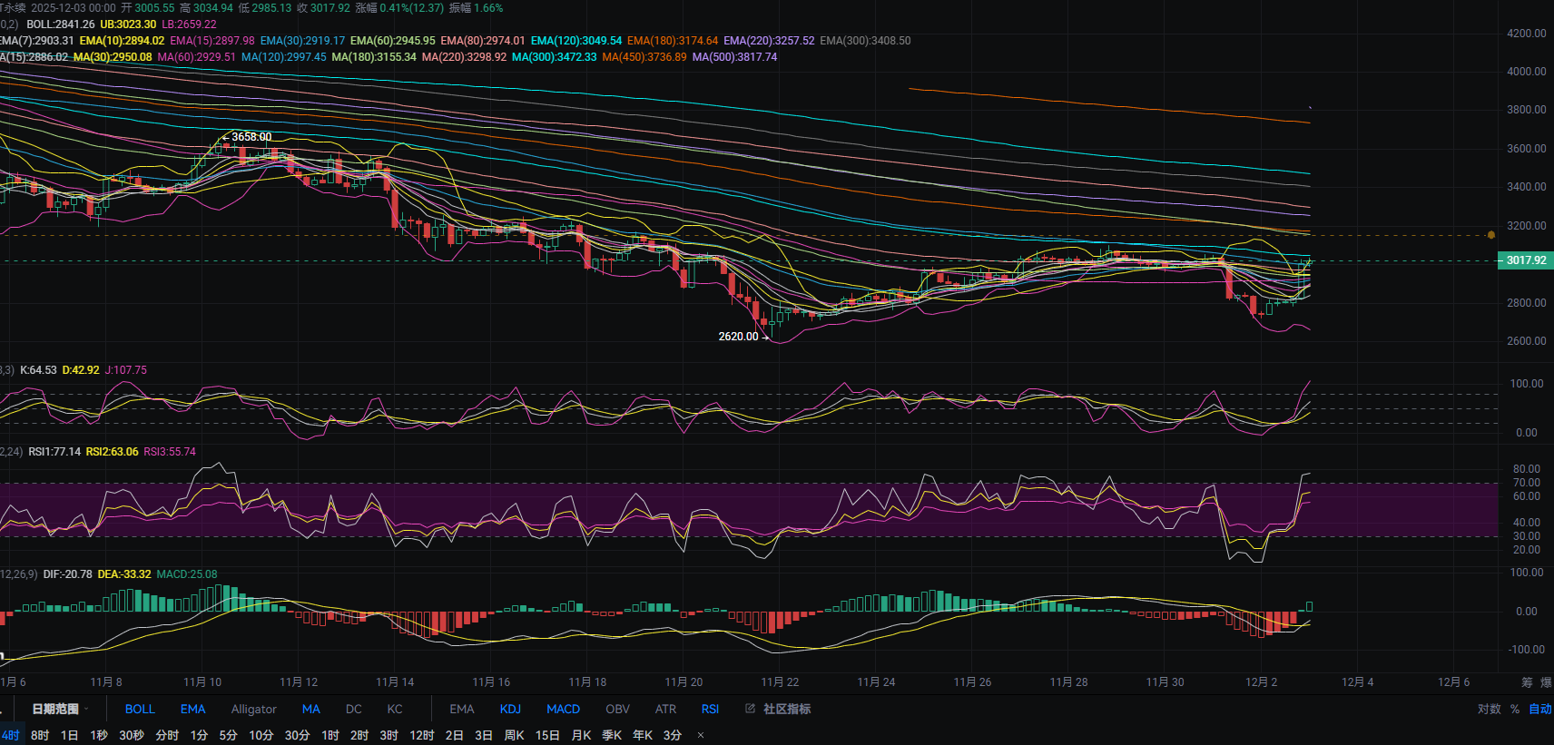 以太坊4小时形成完美的U型反弹,币价再次来到了3000上方,当前级别布林带开口,K线与上轨都在继续冲击EMA120位置,要知道EMA120在上轮反弹中起到关键承压作用,那么本轮反弹的压制点也是可以继续作为参考的,关注前高上方压力继续可以试空,突破后可继续上看到EMA180与MA180交叉(3155-3175)压力区间可以作为第二压力开空点,在MACD中0轴上方是存在放量的,快慢线金叉也是成型开口,多头动能相继存在,那么我们只能抓行情在极限超买后的回撤空间,当前接近前高位置,追多肯定也是不现实的,只能等高空或者回撤后的低多!因为k线处于中上轨区间,那么回撤低多支撑就可以看EMA30与中轨区间介入,也是就是短空的止盈点!
