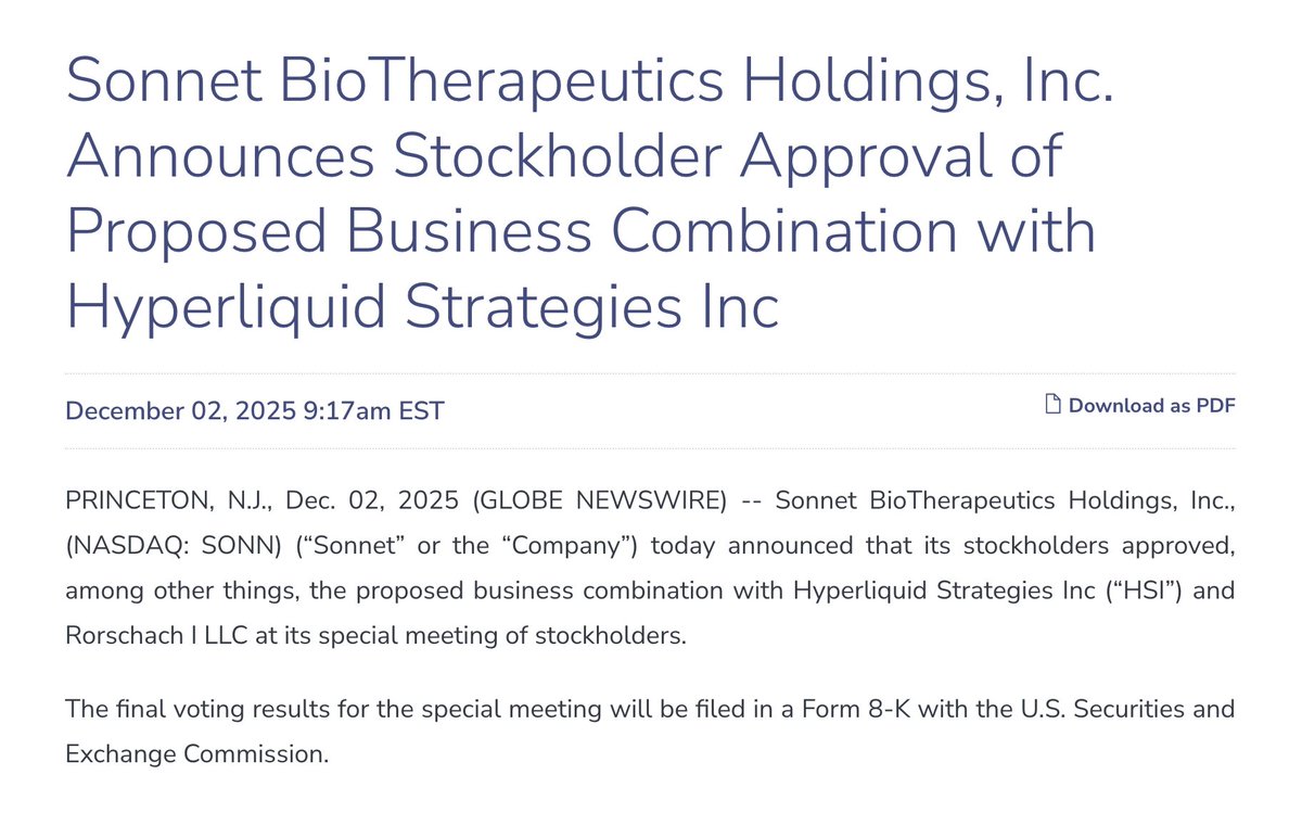 Sonnet生物治疗公司刚刚与Hyperliquid Strategies Inc.合并,建立了HYPE的数字资产库。他们承诺投资8.88亿美元,其中65%以HYPE代币形式承诺,约35%以美元形式承诺。